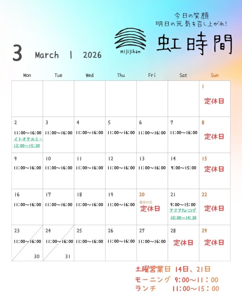 Newsお知らせ 営業時間のお知らせ お知らせ2026.02.24 いつも虹時間をご利用頂き誠にありがとうございます。 3月の営業時間ですが上記カレンダーよりご確認ください。 Instagramでも配信しております。 皆様のご来店、心よりお待ちしております。